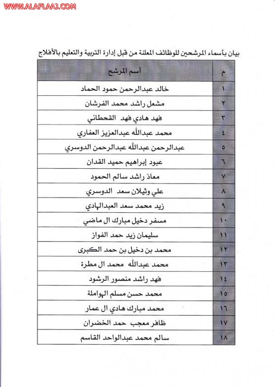 باﻷسماء …تعليم اﻷفلاج يعلن أسماء المرشحين لوظائف مراسلين ومستخدمين وسائقين