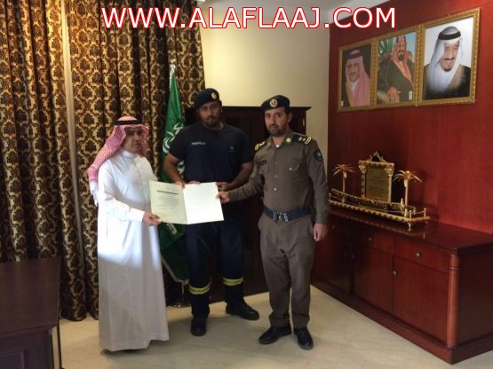 كرّم سعادة محافظ الأفلاج المكلف سعادة الأستاذ عيد القبلان الجندي أول محمد مدهش المجادعة أحد أفراد مركز الدفاع المدني بالهدار بمحافظة الافلاج وذلك لجهده المتميز والمتمثل بانتشال غريق من مجمع ماء في أحد الجبال بمنطقة الشطبة جنوب غرب الهدار . وذلك بحضور مدير إدارة الدفاع المدني في الأفلاج المقدم محمد بن فالح الدوسري .