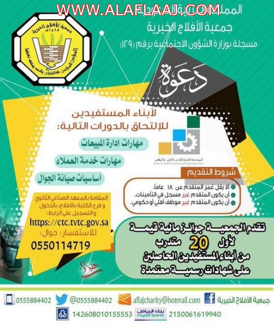 تقوم جمعية الأفلاج الخيرية بدورات تدريبية لأبناء المستفيدين المسجلين بالجمعية بالتعاون مع المعهد المهني في محافظة الأفلاج مع العلم بأن الدورات هي كالتالي :-