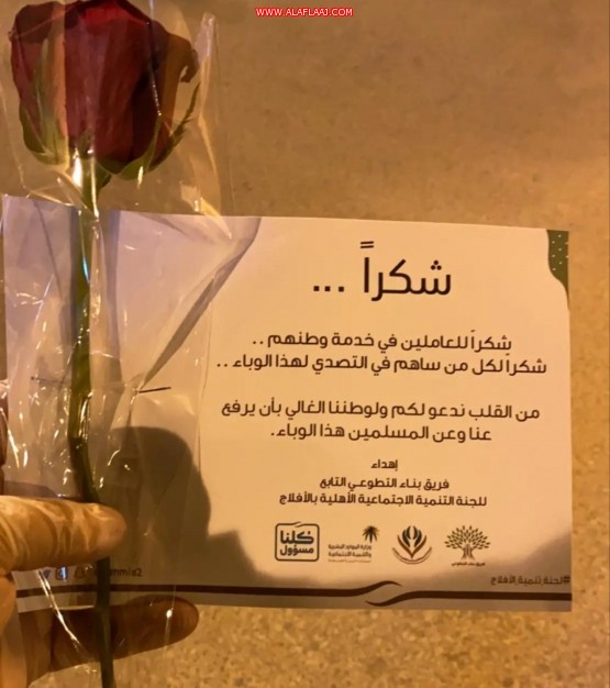 قدم أعضاء فريق بناء التطوعي التابع للجنة تنمية الأفلاج إهداء لرجال الأمن نظير جهودهم في تفعيل حظر التجول بمحافظة الأفلاج ضمن المساهمة في الحد من انتشار فيروس كورونا .