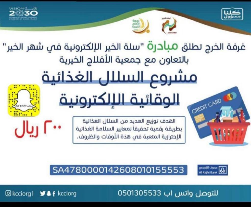 بحضور نائب رئيس مجلس إدارة جمعية الأفلاج الخيرية الأستاذ شبيب بن محمد آل فهيد و سعادة مدير فرع الغرفة التجارية في الأفلاج الأستاذ مشاري بن عبدالعزيز المواش أطلقت الجمعية مبادرة غرفة الخرج ( سلة الخير الاكترونية ) عصر اليوم في مبنى جمعية الأفلاج الخيرية .