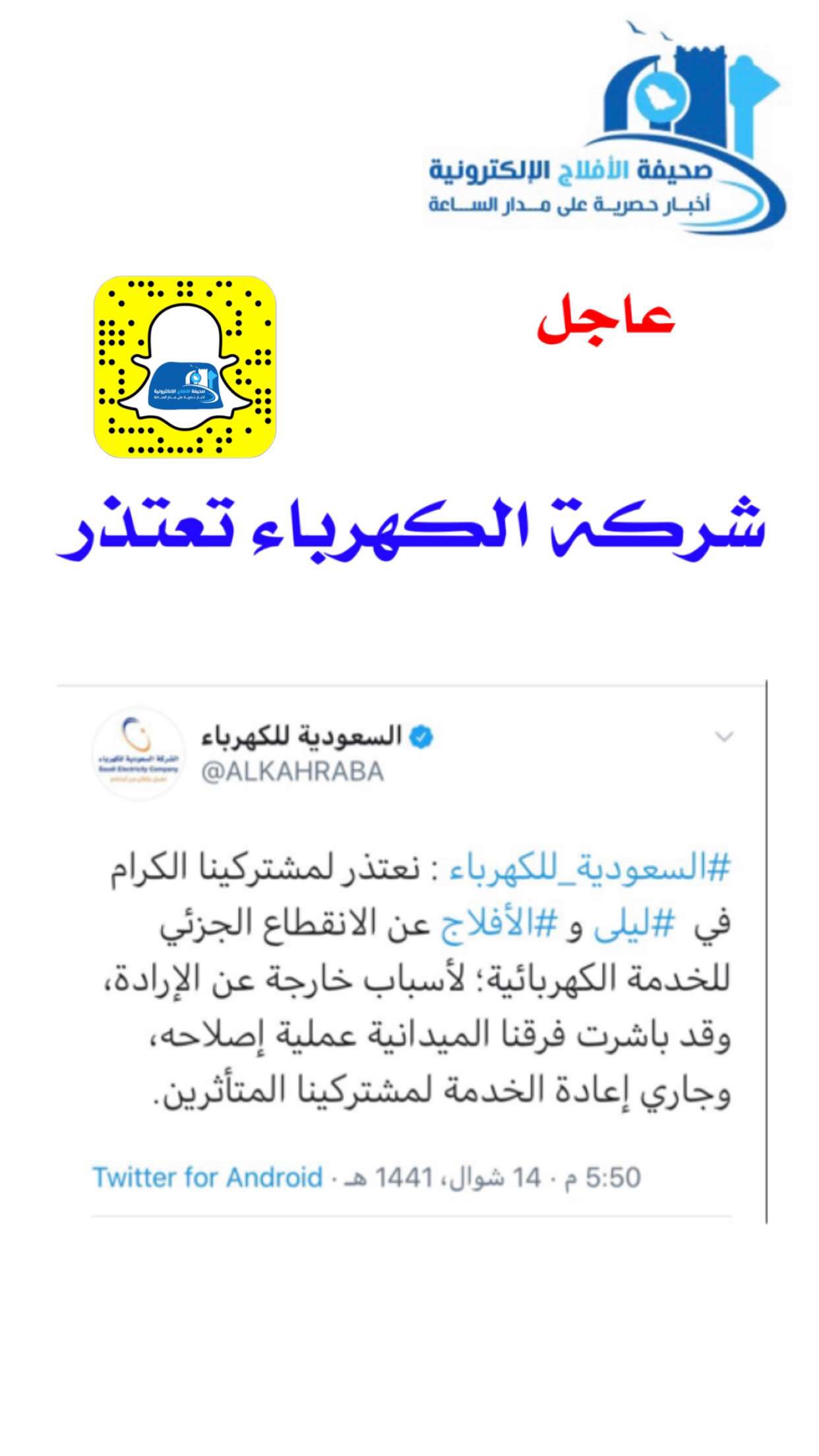 الكهرباء” تعتذر عن انقطاع الخدمة  في “الأفلاج” وتعمل على إعادتها