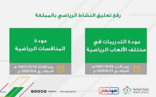 أعلنت وزارة الرياضة رفع تعليق النشاط الرياضي في المملكة ابتداءً من يوم الأحد 29 شوال 1441هـ الموافق 21 يونيو 2020، بما في ذلك عودة تدريبات الأندية في مختلف الألعاب.