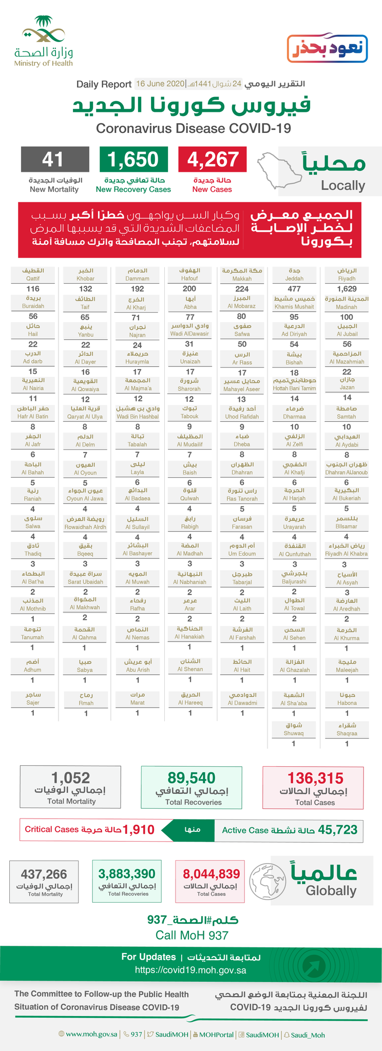 أعلنت وزارة الصحة، اليوم الثلاثاء 16 يونيو 2020، تسجيل 4267 حالة إصابة جديدة بفيروس كورونا الجديد (كوفيد-19) ليصبح الإجمالي 136315 حالة .
