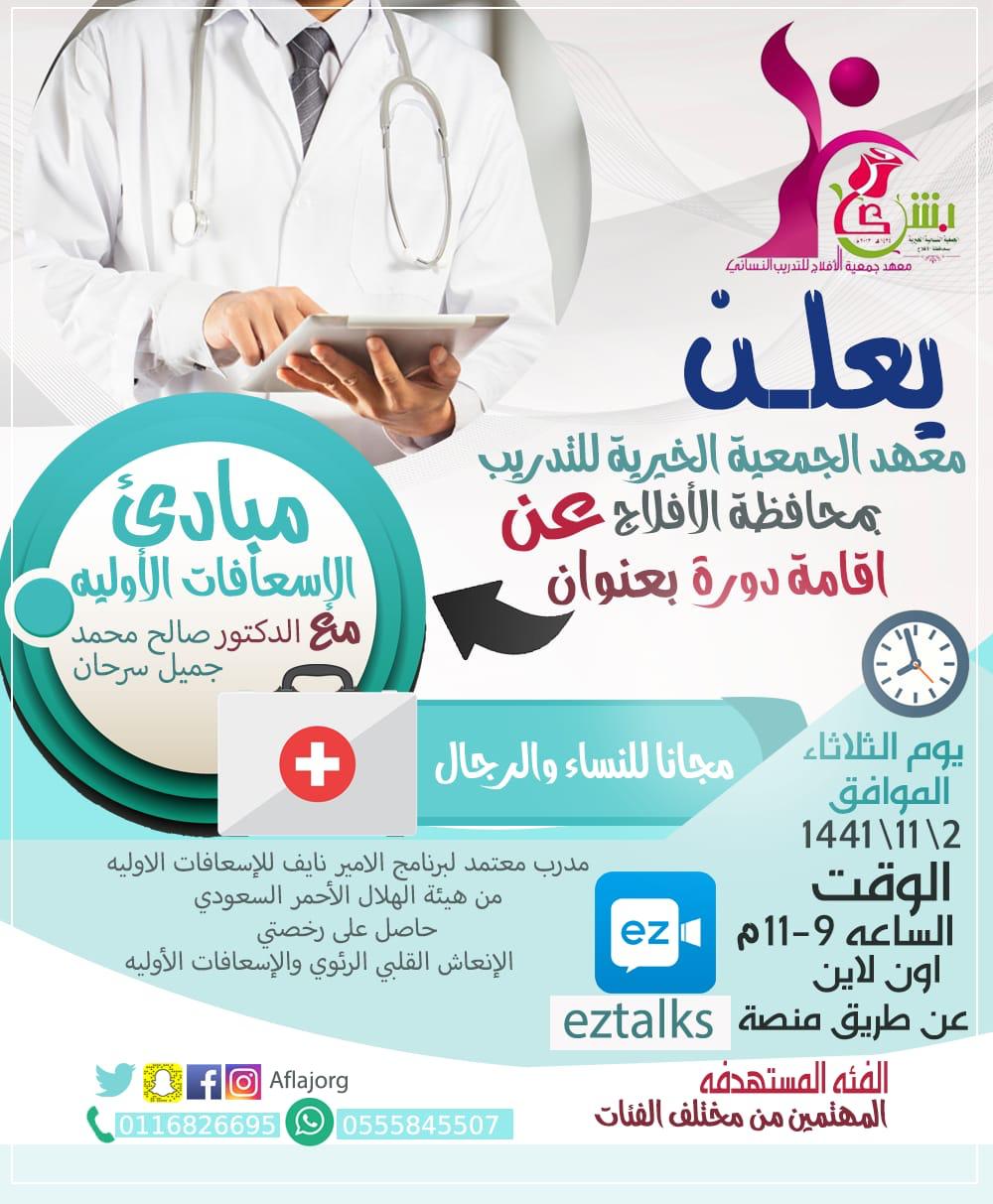 اعلن معهد الجمعية الخيرية للتدريب بمحافظة الأفلاج عن اقامة دورة مبادئ الإسعافات الأولية وذلك بتقديم د.صالح محمد جميل يوم الثلاثاء الموافق 1441/11/2هـ الساعة 9-11م اون لاين عن طريق منصة eztalks .