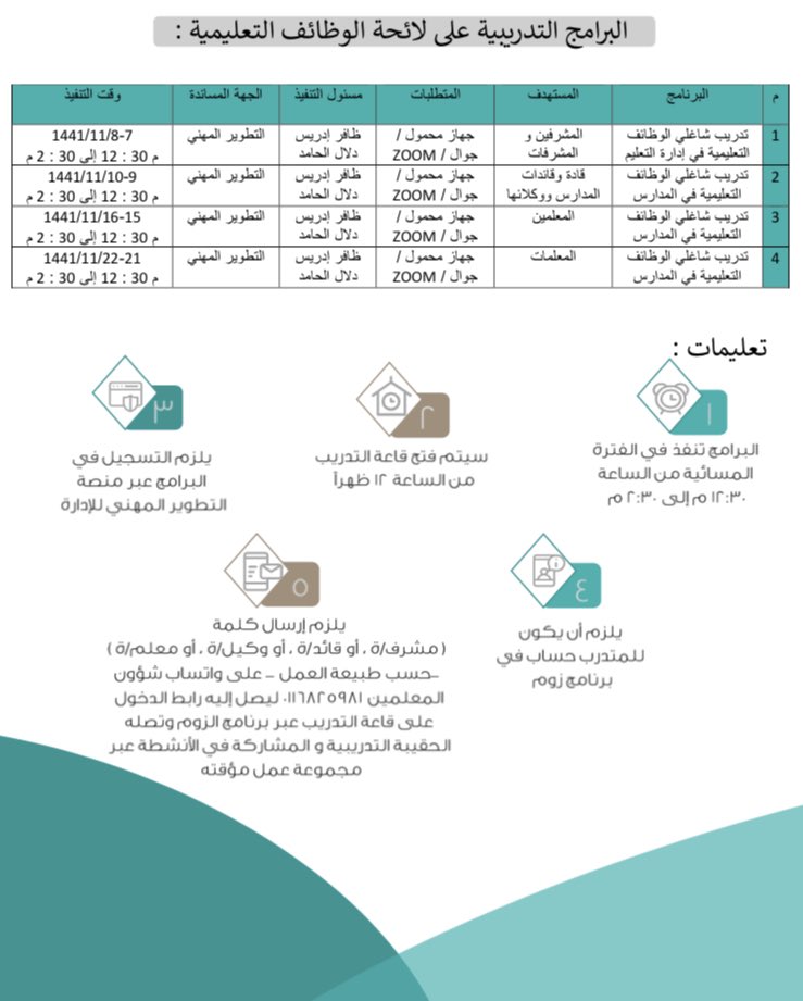 وأوضحت إدارة تعليم الأفلاج أن البرامج ستنفذ في الفترة المسائية من الساعة 12:30 حتى الساعة 2:30 مساءً , كما أوضحت أن البرامج ستكون عبر برنامج الزوم وسيتم فتح قاعة الزوم الساعة 12 ظهراً , واشترطت الإدارة التسجيل في منصة التطوير المهني للإدارة من أجل الإستفادة من البرامج وإرسال كلمة ( مشرف/ة أو قائد/ة أو وكيل/ة أو معلم/ة) حسب طبيعة عمله وذلك على رقم واتساب شؤون المعلمين المرفق في صورة إعلان البرامج لكي يصله تفاصيل البرنامج التدريبي .