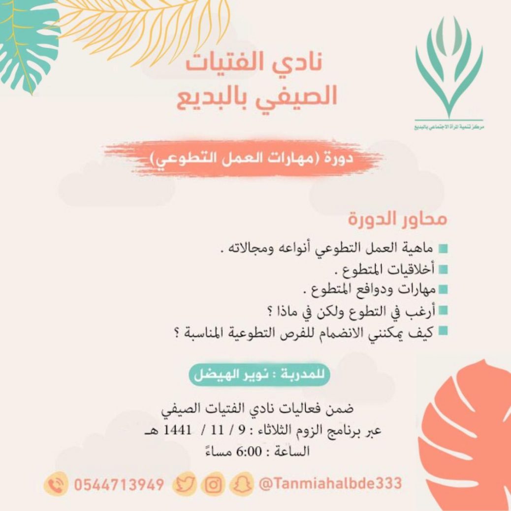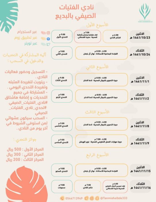 اختتم مركز تنمية المرأة الاجتماعي بالبديع “نادي الفتيات الصيفي” في موسمه الثالث “عن بُعد” ، والذي استمر لأربعة أسابيع من تاريخ انطلاقه الموافق : 23 / 10 / 1441 هـ .