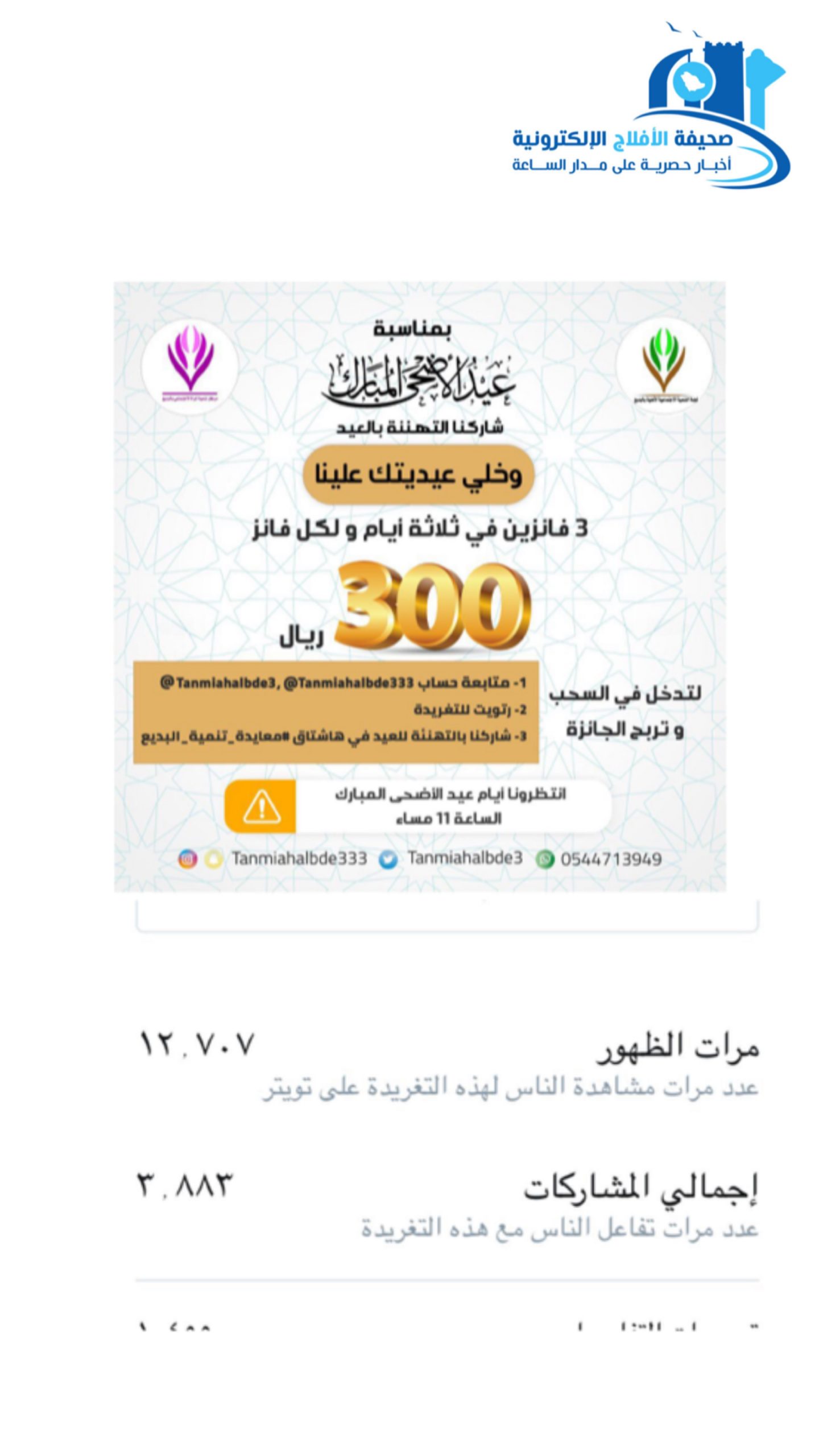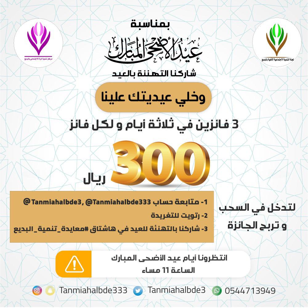 اختتمت لجنة التنمية الاجتماعية الأهلية بالبديع معايدتها من خلال منصة تويتر الرسمية الخاصة باللجنة والتي استمرت لثلاثة أيام العيد حيث طرحت المعايدة من خلال هاشتاق اطلقته اللجنة ويتم السحب يوميا على ثلاثة فائزين قيمة العيدية الواحدة 300 ريال المعايدة لقت اقبال كبير من داخل البديع وخاوجة تفاعل معها المغردون عبر حساباتهم