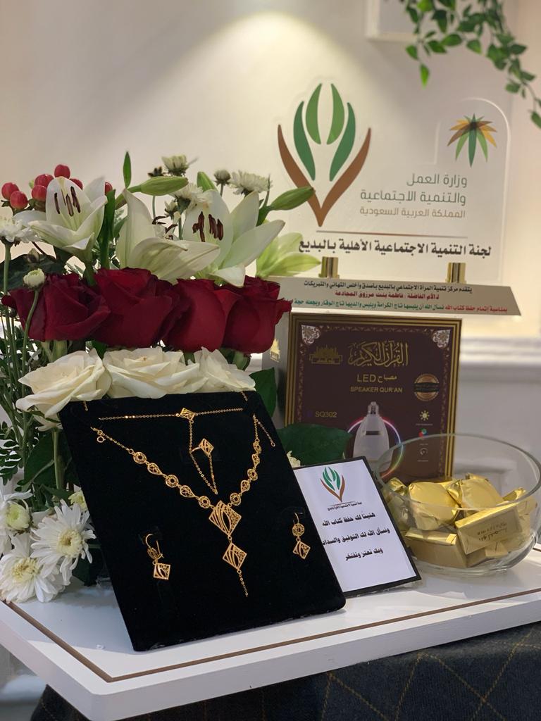 قام وفد من تنمية البديع ممثلة في مركز تنمية المرأة الاجتماعي بالبديع الثلاثاء 14/13/1441 بزيارة لحافظة القرآن الفاضلة فاطمة بنت مرزوق المجادعة وذلك لتقديم تكريم خاص لها على ما من الله عليها من إتمام حفظ القرآن الكريم حيث كان التكريم عبارة عن طقم ذهب وجهاز استماع القرآن لأئمة الحرمين ومجموعة من القراء ودرع اللجنة حيث قدم التكريم المشرفة على البرامج النسائية الأستاذة موضي بنت راشد آل تميم التي نقلت لها فخر وشعور اللجنة بهذا الانجاز الذي يدعو للفخر. داعين الله بأن يحفظها بحفظه ويمدها بطاعته ويجعل ذلك في ميزان حسناتها وأن يبارك لها في عمرها وأولادها وأسرتها.