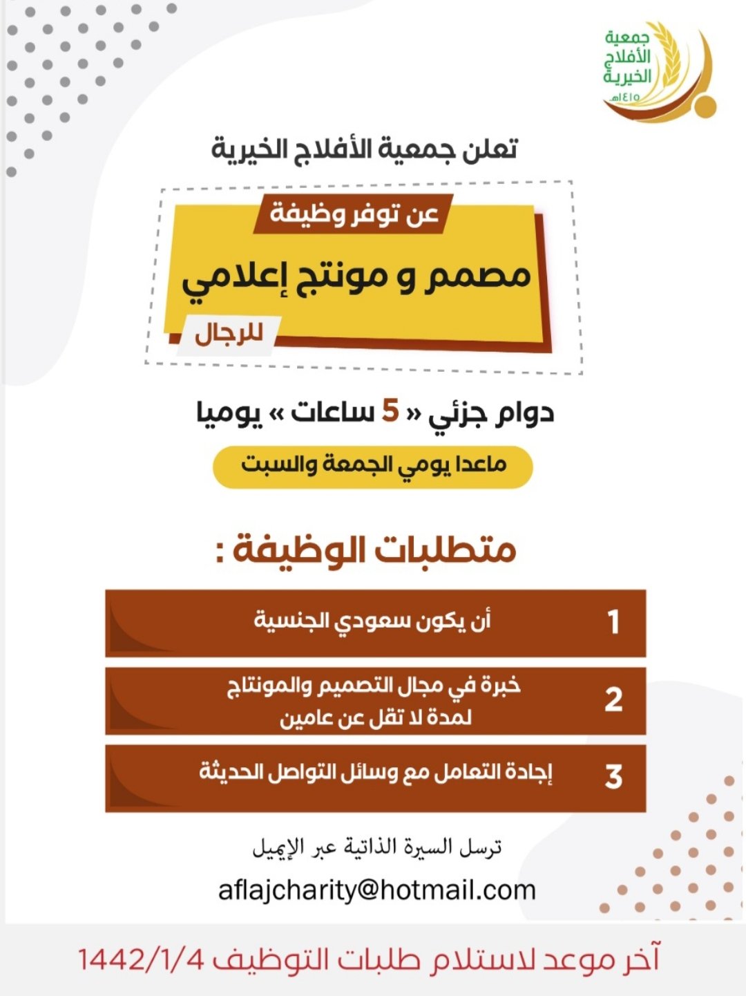 تعلن جمعية الأفلاج الخيرية عن توفر وظيفة بمسمى : “مصمم ومونتاج إعلامي” للرجال ..