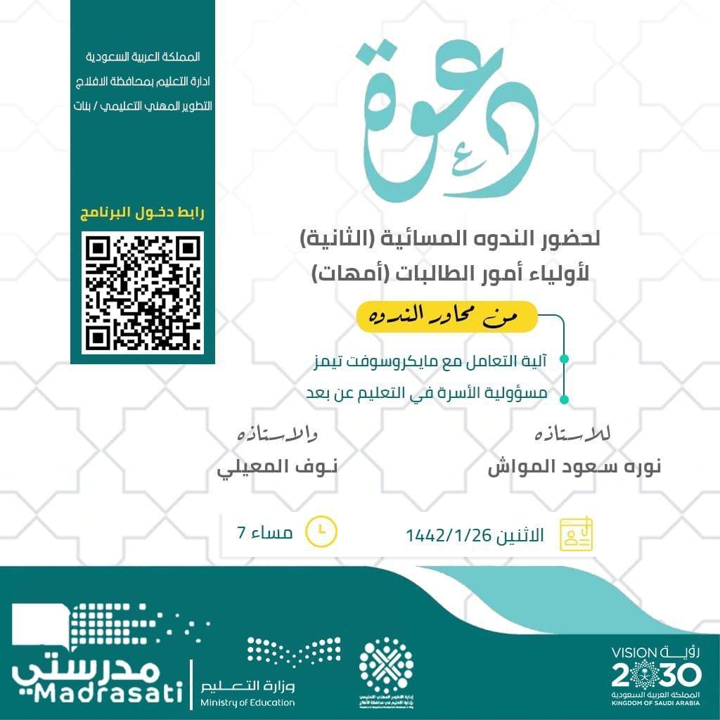 إدارة تعليم الأفلاج تدعو أولياء أمور الطالبات (الأمهات) إلى ندوة عن مسؤولية الأسرة في ⁧‫”التعليم عن بُعد‬⁩”
