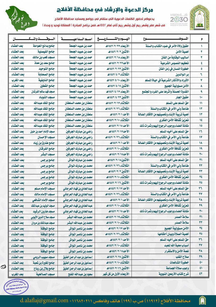 ينظم فرع وزارة الشؤون الإسلامية والدعوة والإرشاد بمنطقة الرياض سلسلة من الكلمات العلمية في مساجد وجوامع محافظة الأفلاج والمراكز التابعة لها بعد صلاتي المغرب والعشاء ، وبلغت الكلمات ٤٢ كلمة في ٢٧ جامع ومسجد موزعة على مدينة ليلى والمراكز والقرى والهجر التابعة للمحافظة .