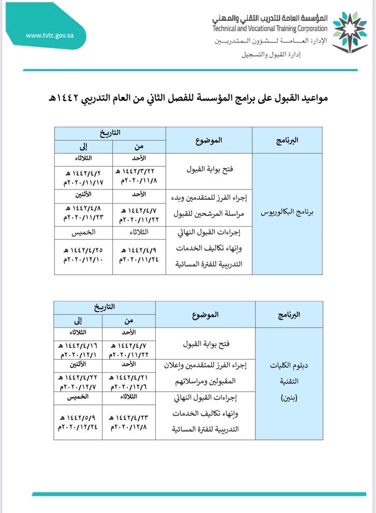 أعلنت الكلية التقنية بالأفلاج عن مواعيد التقديم للقبول في دبلوم التخصصات ( المحاسبة، الدعم الفني، ميكانيكا السيارات) للفصل التدريبي الثاني للعام ١٤٤٢هـ من خلال موقع القبول الموحد