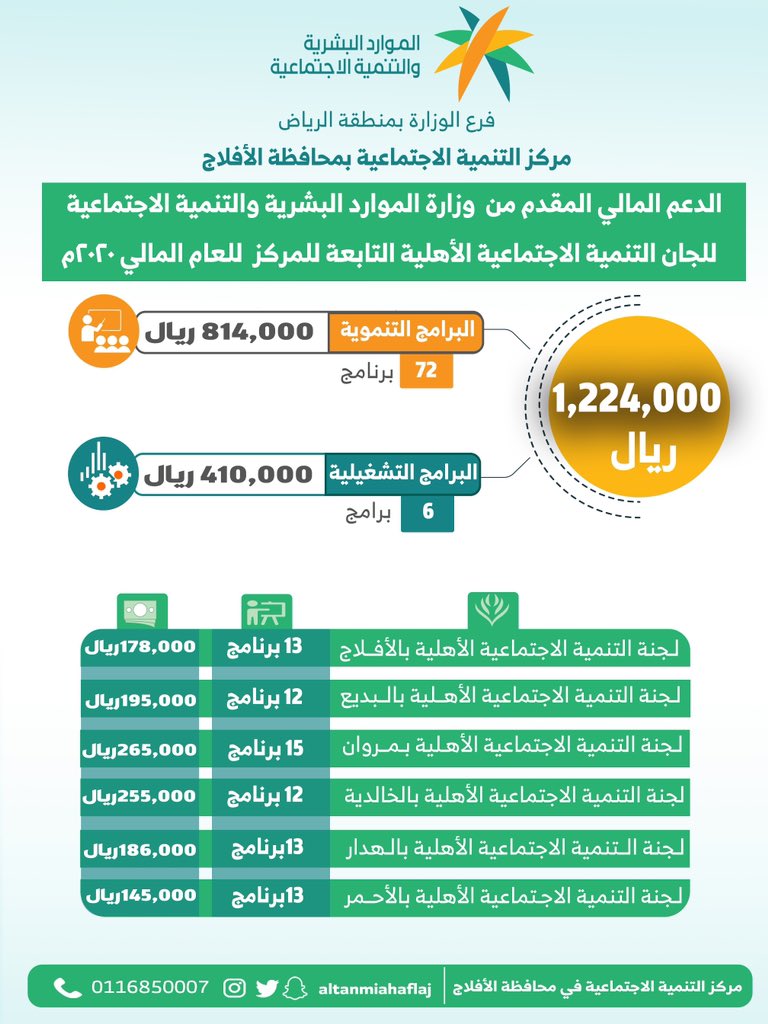 وحصلت لجنة التنمية الإجتماعية بمروان على أكبر دعم مالي بمبلغ وقدرة ٢٦٥ ألف ريال مقابل ١٥ برنامجاً   وتلتها لجنة التنمية الإجتماعية بالخالدية بمبلغ وقدرة ٢٥٥ ألف ريال مقابل ١٢ برنامجاً ثم لجنة التنمية الإجتماعية بالبديع بمبلغ وقدرة ١٩٥ ألف ريال مقابل ١٢ برنامجاً ثم تلتها لجنة التنمية الإجتماعية بالهدار بمبلغ وقدرة ١٨٦ ألف ريال مقابل ١٣ برنامجاً ثم لجنة التنمية الإجتماعية بالأفلاج بمبلغ وقدرة  ١٧٨ألف ريال مقابل ١٣ برنامجاً وحصلت الأخيرة لجنة التنمية الإجتماعية الأهلية بالأحمر على مبلغ وقدرة ١٤٥ ألف ريال مقابل ١٣ برنامجاً وبمجموع إجمالي وقدرة ٨١٤ ألف ريال للجان في محافظة الأفلاج ومراكزها