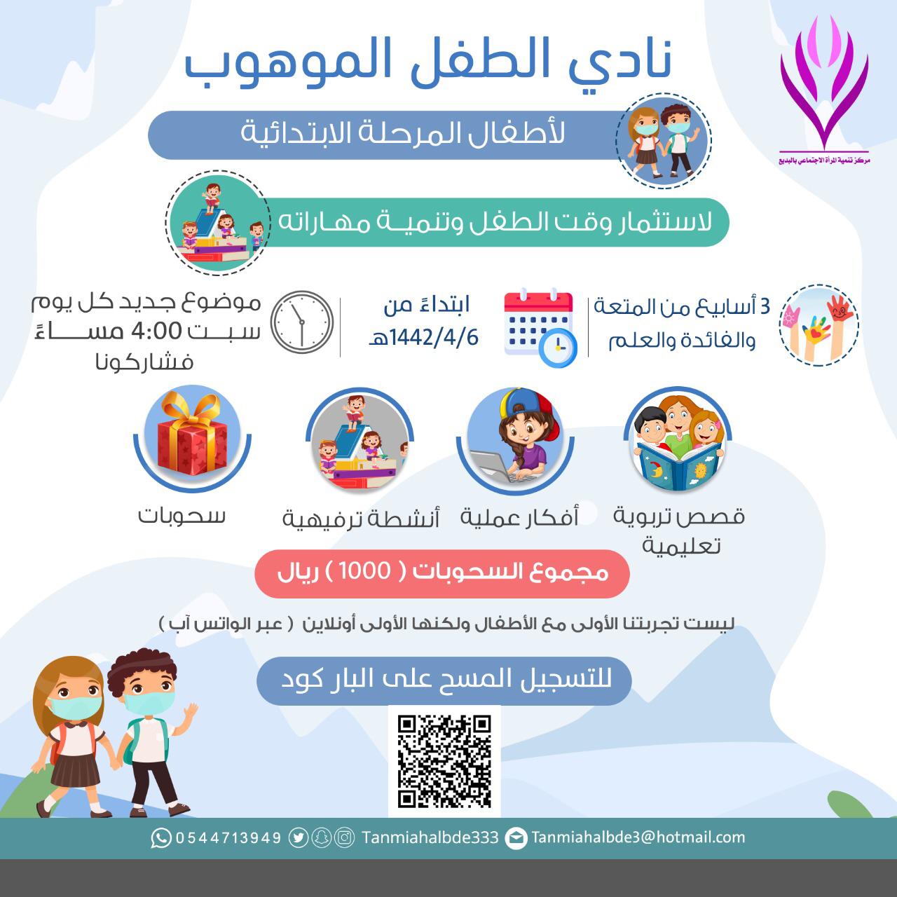 يعلن مركز تنمية المرأة الاجتماعي بالبديع عن فتح باب التسجيل ( لنادي الطفل الموهوب) لأول مره “عن بعد” ابتداءً من 6 ربيع الثاني 1442هـ ، وذلك إتباعًا للبروتوكولات الصحية الوقائية إثر جائحة كورونا .