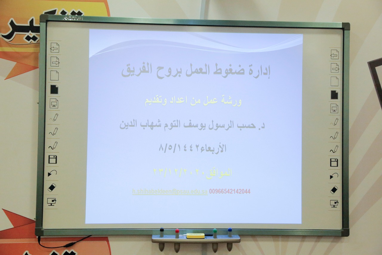 اقامت كليات الجامعة بمحافظة الافلاج ورشة عمل بعنوان ادارة ضغوط العمل بروح الفريق اليوم الاربعاء 8/5/1443 الموافق 23/12/2020 واستهدفت الورشة 35 من اعضاء هيئة التدريس وموظفي الكليات عبر برنامج زووم وهدفت بشكل اساسي الى التعرف على ضغوط العمل واسبابها وثاثيراتها وطرق علاجها والتغلب عليها من خلال العمل بروح الفريق وقد نالت الورشة استحسان جميع المتدربين وتم اثراء الدورة بمداخلات المتدربين مما اضاف اليها بعد اخر وقد نفذ الورشة سعادة الدكتور حسب الرسول يوسف التوم الاستاذ المشارك بقسم ..