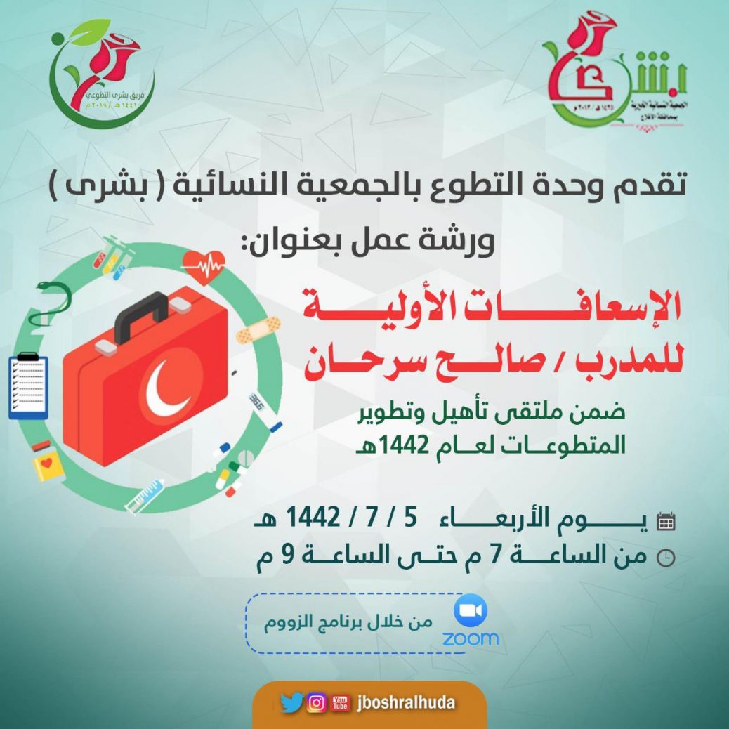 تقيم وحدة التطوع بالجمعية النسائية (بشرى) بمحافظة الأفلاج ورشة عمل بعنوان “الإسعافات الأولية” يقدمها المدرب: صالح السرحان وذلك يوم غداً الأربعاء 1442/7/5.
