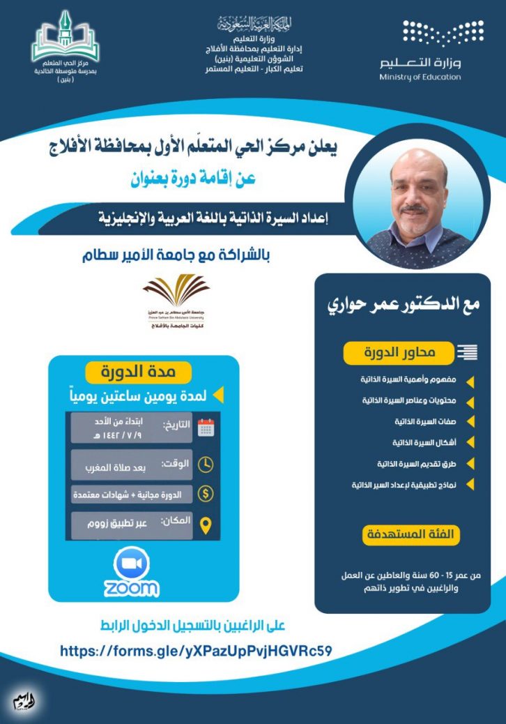 وقد أعلن المركز عن استئناف البرامج والدورات التدريبية “عن بُعد” بإقامة دورة تدريبية بعنوان ” إعداد السيرة الذاتية باللغة العربية والإنجليزية” بالشراكة مع جامعة الأمير سطام بن عبدالعزيز بالأفلاج ويقدمها الدكتور: “عمر حواري ” وذلك يومي ( الأحد والإثنين ) بواقع ساعتين يوميًا بعد صلاة المغرب مباشرة .
