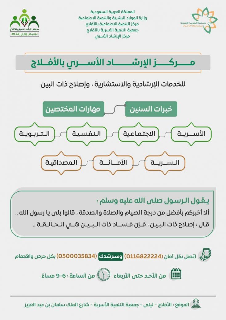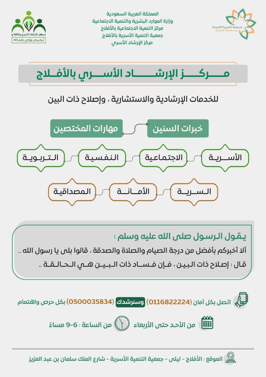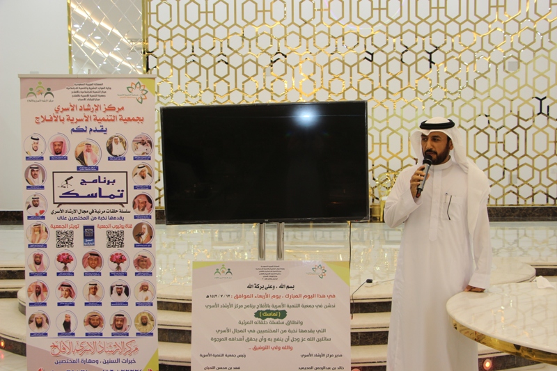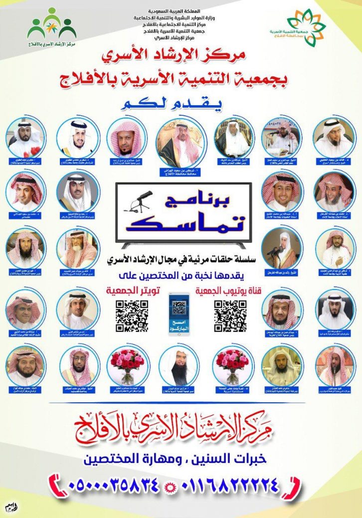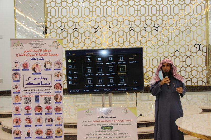 دشن مركز الإرشاد الأسري التابع لجمعية التنمية الأسرية بالأفلاج برنامجه “تماسك” بحضور مدير مركز التنمية الاجتماعية بالأفلاج الأستاذ: معجب الكبيري وعددا من منسوبي الجمعيات الخيرية بالمحافظة.