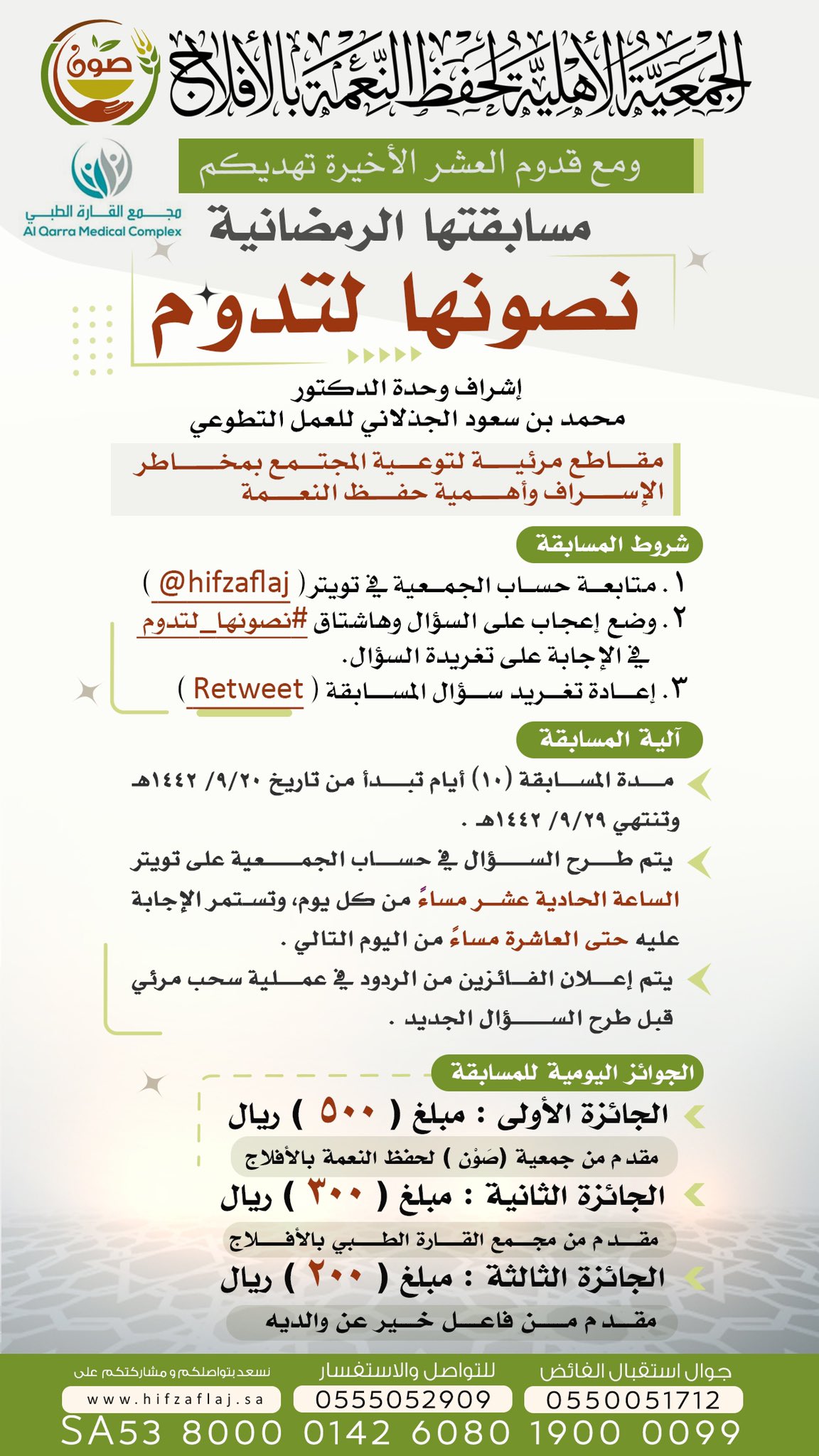 حيث بين رئيس مجلس إدارة جمعية حفظ النعمة “صون” بمحافظة الأفلاج عضو المجلس الفرعي لجمعيات حفظ النعمة بالمملكة الأستاذ عبدالرحمن القنعير أن المسابقة تنطلق في اليوم العشرون من شهر رمضان المبارك وحتى اليوم التاسع والعشرون من نفس الشهر وذلك عبر حسابها على موقع التواصل الإجتماعي تويتر hifzaflaj@ .