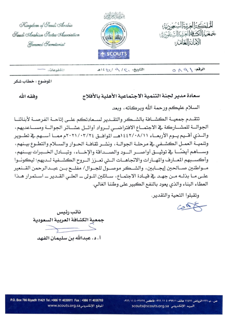 وجه سعادة نائب جمعية الكشافة العربية السعودية أ.د.عبدالله سليمان الفهد خطاب شكر للفرق الكشفية بلجنة تنمية الأفلاج على مشاركتهم الفاعلة في الاجتماع الافتراضي لرواد أوائل الجوالة بالمملكة والذي أقيم بتاريخ 1442/8/11.