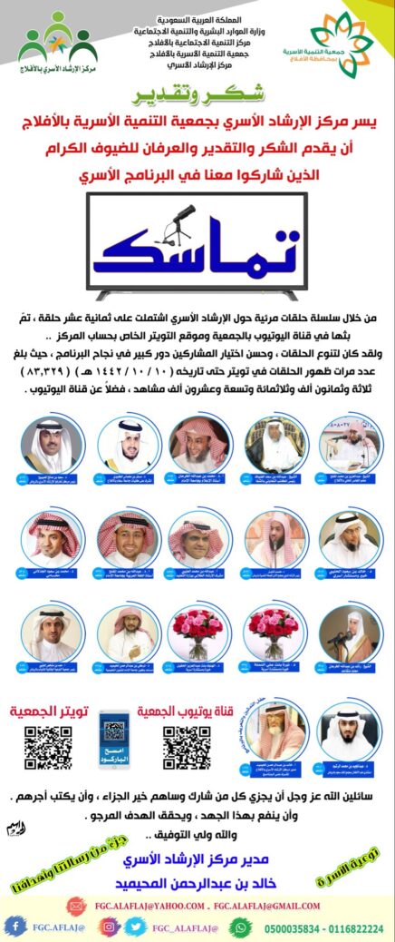 قدم مركز الإرشاد الأسري التابع لجمعية التنمية الأسرية بالأفلاج شكره وتقديره للضيوف الذين شاركو مع المركز في برنامج ” تماسك “والذي تم تنظيمه خلال الفترة الماضية من خلال سلسلة من الحلقات المرئية حول الإرشاد الأسري اشتملت على ١٨ حلقة بثها المركز عبر حساباته الرسمية في وسائل التواصل الاجتماعي.