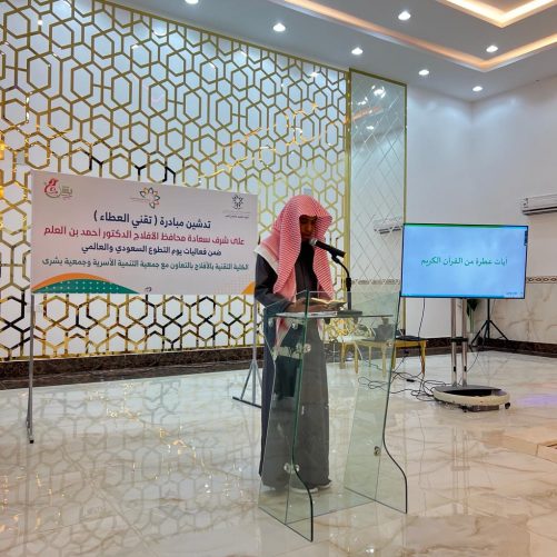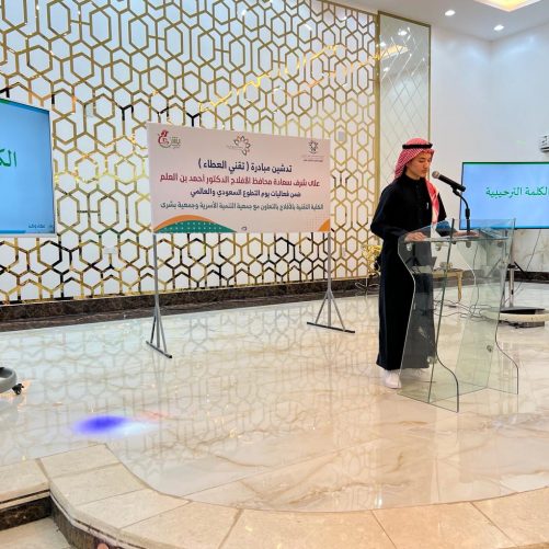 هذا ودشن المبادرة عميد الكلية المهندس عيسى الزيادي ومدير مركز التنمية الاجتماعية الأستاذ عبدالرحمن الخميسة و المشرف المالي بجمعية التنمية الأسرية بالأفلاج الأستاذ إبراهيم الهزاع في احتفائية حضرها عدد من المسؤولين والمواطنين وفرق كشفية وتطوعية في قاعة بشرى للمؤتمرات والمناسبات .