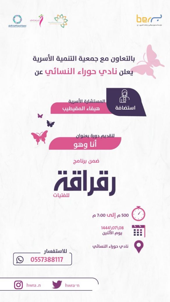 أعلن “نادي حوراء النسائي” التابع لجمعية تنمية الأفلاج عبر حسابه الرسمي بتويتر عن تنظيم دورة ” أنا و هو ” والذي تأتي ضمن برنامج رقراقة للفتيات ويستضيف البرنامج المستشارة ” هيفاء المقيطيب”.