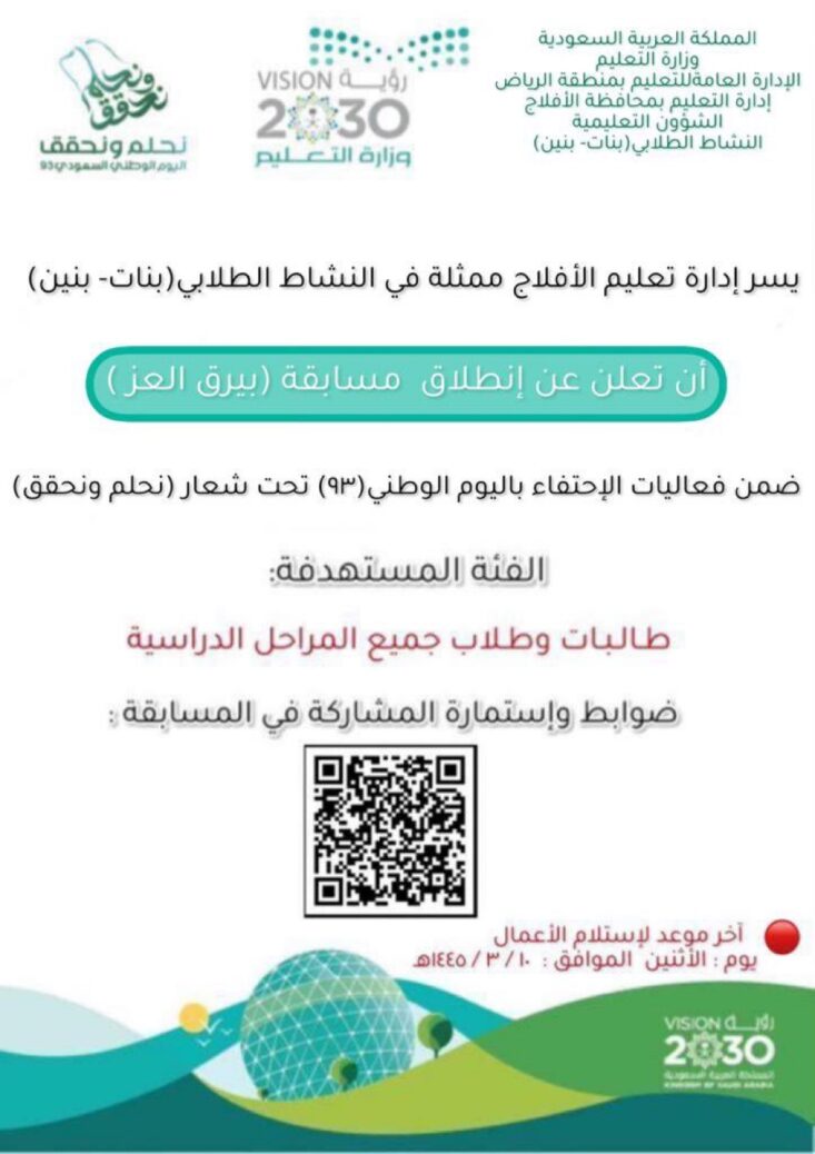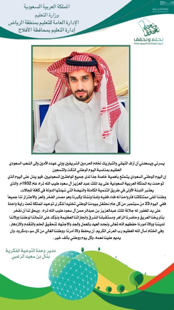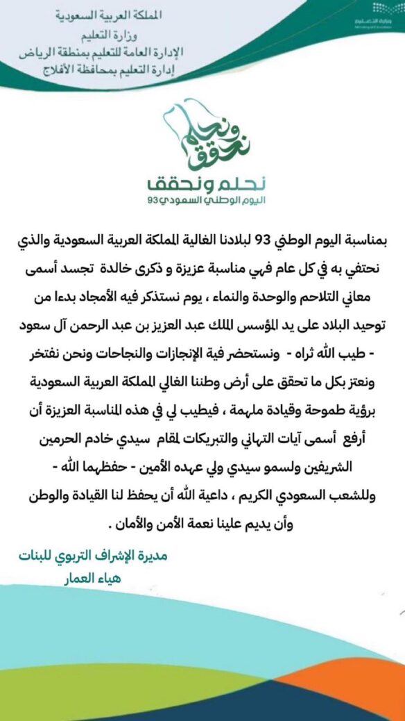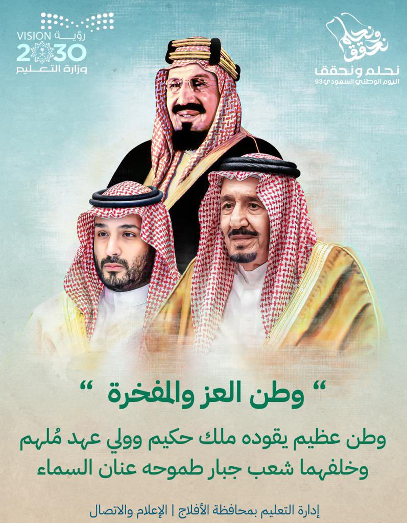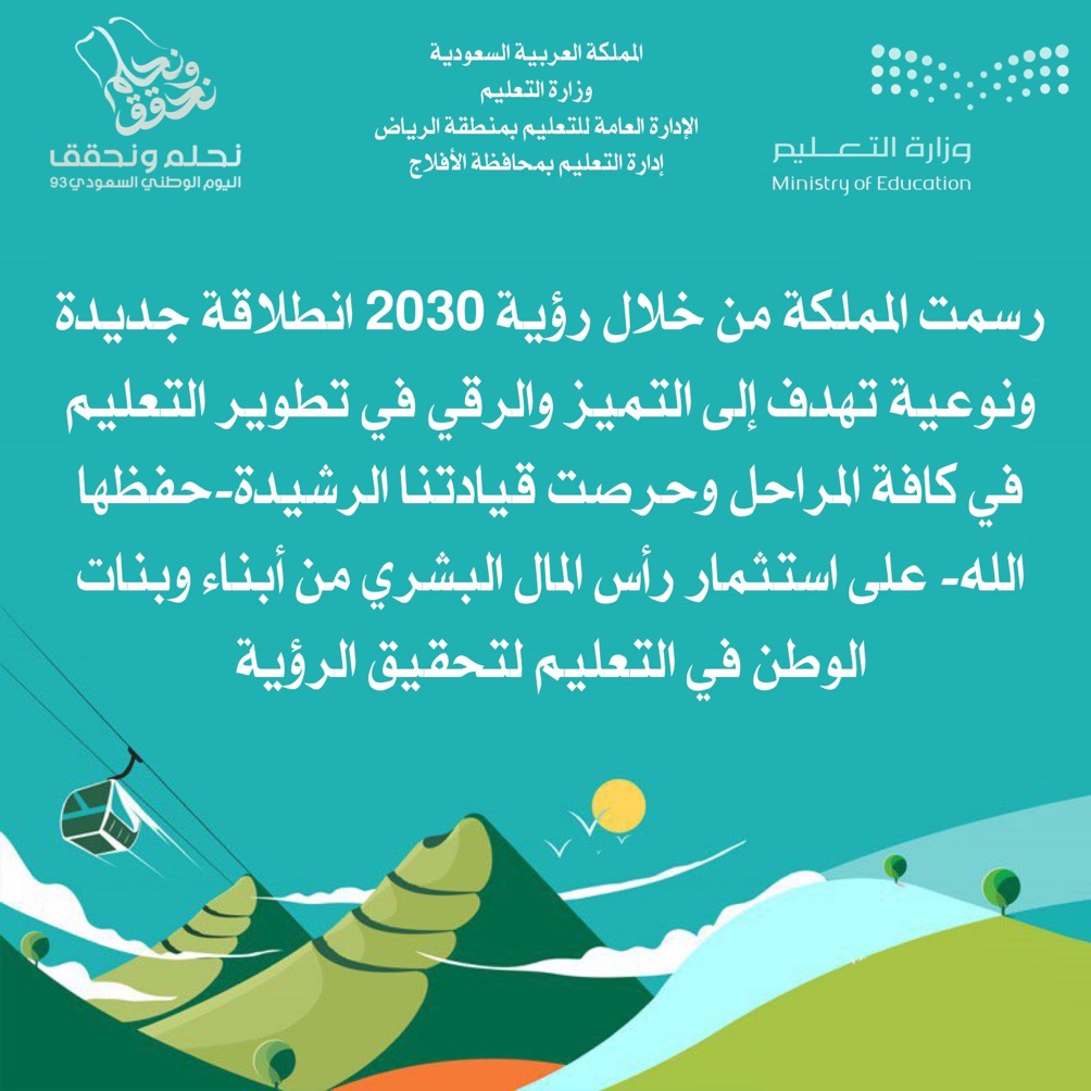 احتفل مكتب التعليم بمحافظة الأفلاج باليوم الوطني الـ ٩٣ بكلمات لعدد من مسؤلي التعليم وتنظيم ورش عمل ومسابقات وطنية .
