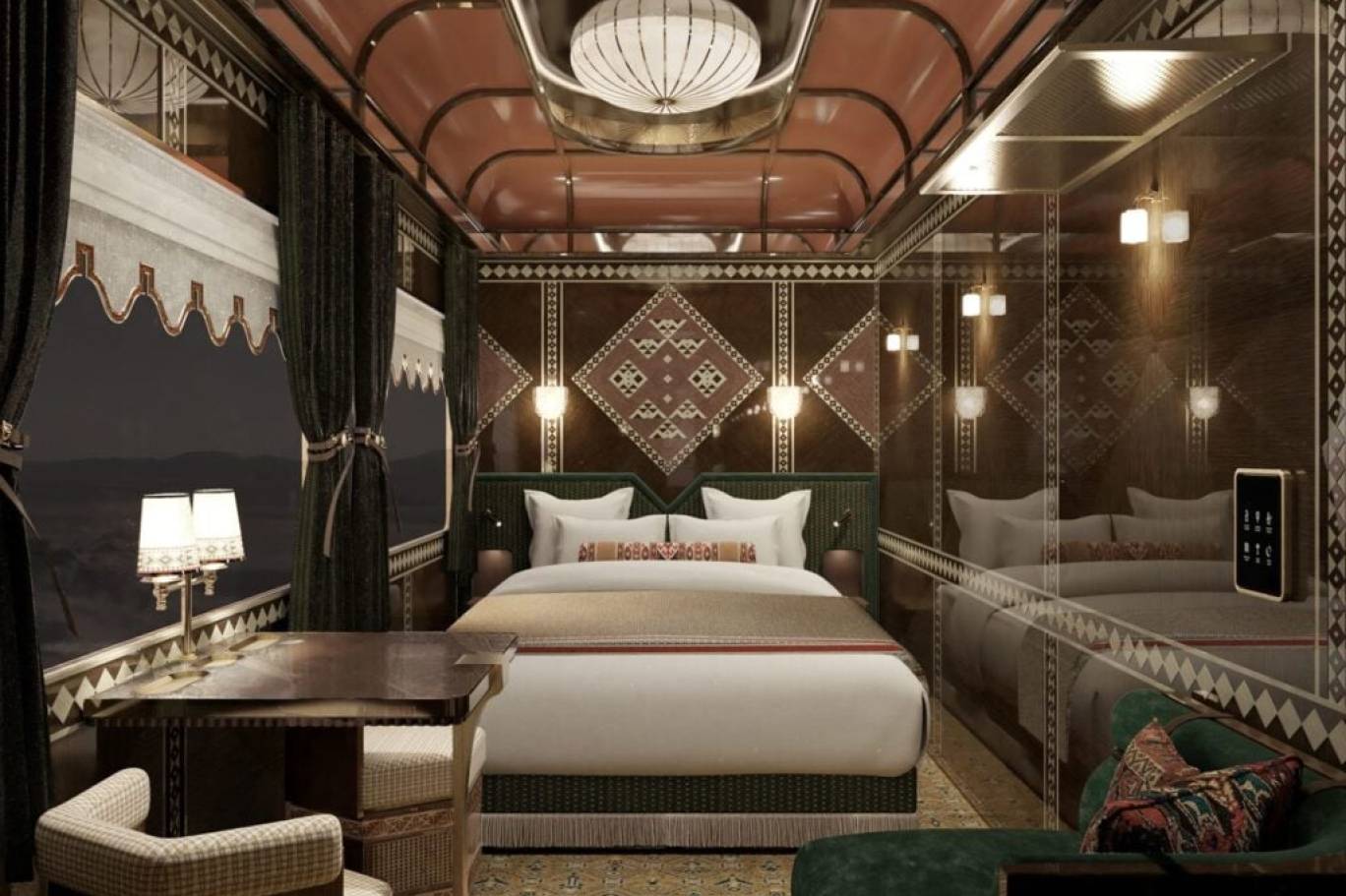 وتتزين عرباته الداخلية بصالة مجلس فاخرة، وممرات تعرض أعمالاً فنية وصوراً فوتوغرافية تبرز جمال الطبيعة السعودية فيما تتناغم الألوان الرملية والمنسوجات الفاخرة مع الزخارف المستوحاة من العلا وحائل، لتصوغ تجربة بصرية وثقافية متكاملة.