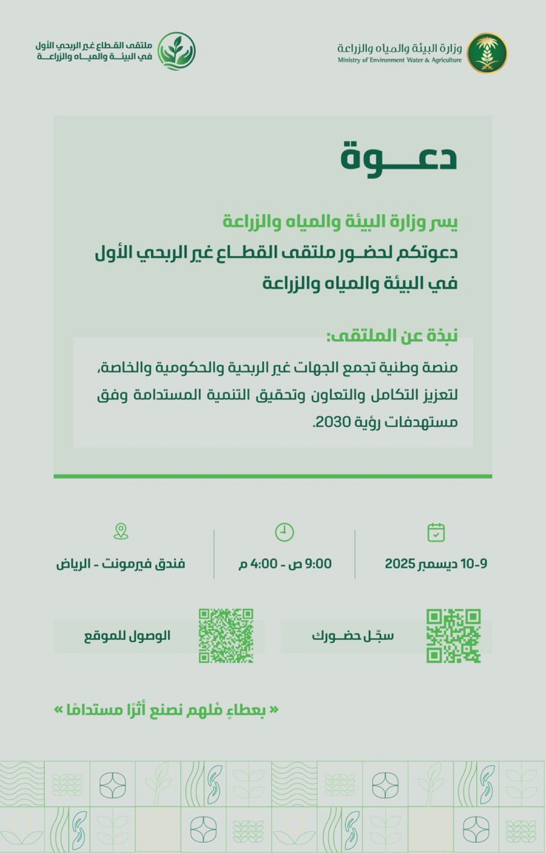 قدمت وزارة البيئة والمياه والزراعة الدعوة للمشاركة في ملتقى القطاع غير الربحي الأول في قطاعات البيئة والمياه والزراعة، بهدف تعزيز الشراكات التنموية بين الجهات الحكومية والمنظمات غير الربحية، وتحقيق أثر مستدام في حماية البيئة وتنميتها.