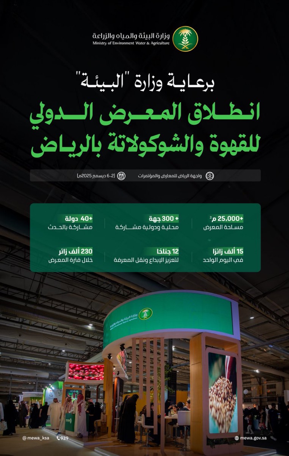 انطلقت فعاليات المعرض الدولي للقهوة والشوكولاتة في الرياض، الذي تنظمه وزارة البيئة والمياه والزراعة في دورته الأضخم حتى الآن، بمشاركة أكثر من 300 علامة تجارية وعارض من أكثر من 40 دولة حول العالم.