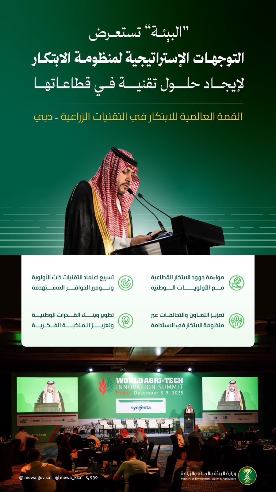 منصة مواسم الرياض > الأخبار > أخبار المعارض والمؤتمرات > وزارة البيئة تستعرض التوجهات الاستراتيجية لمنظومة الابتكار خلال مشاركتها في فعاليات القمة العالمية للابتكار في التقنيات الزراعية (أجريتك)