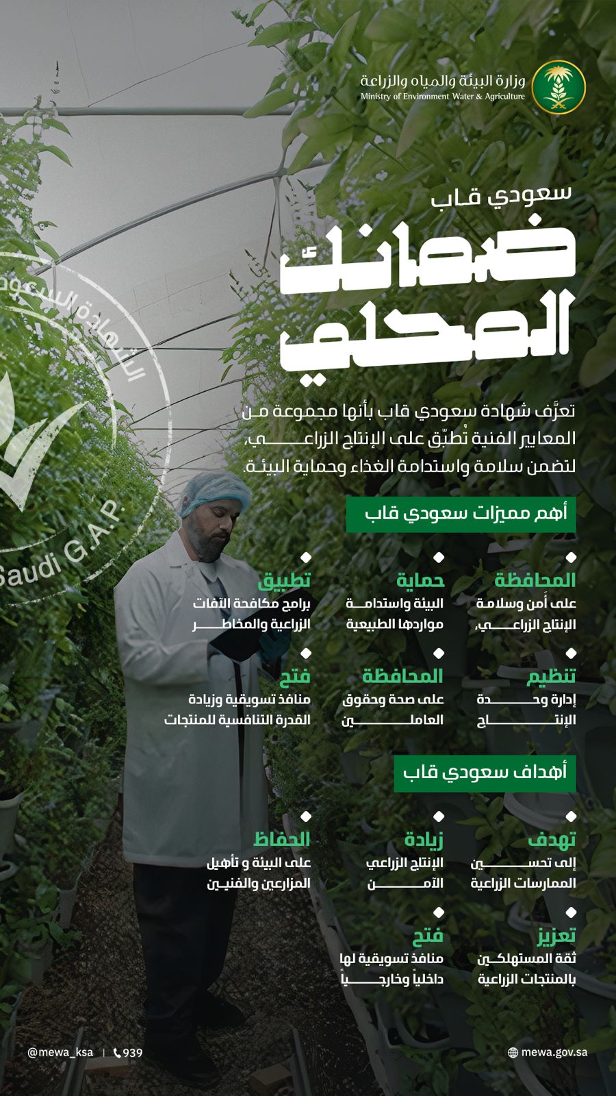 أطلقت وزارة البيئة والمياه والزراعة حملة توعوية جديدة بعنوان “ضمانك المحلي”؛ للتعريف ببرنامج الممارسات الزراعية السعودية الجيدة في المملكة Saudi G.A.P، وذلك ضمن جهودها المتواصلة لتعزيز استدامة القطاع الزراعي والإنتاج المحلي، ورفع جودة وسلامة الغذاء، ودعم مستهدفات رؤية السعودية 2030.