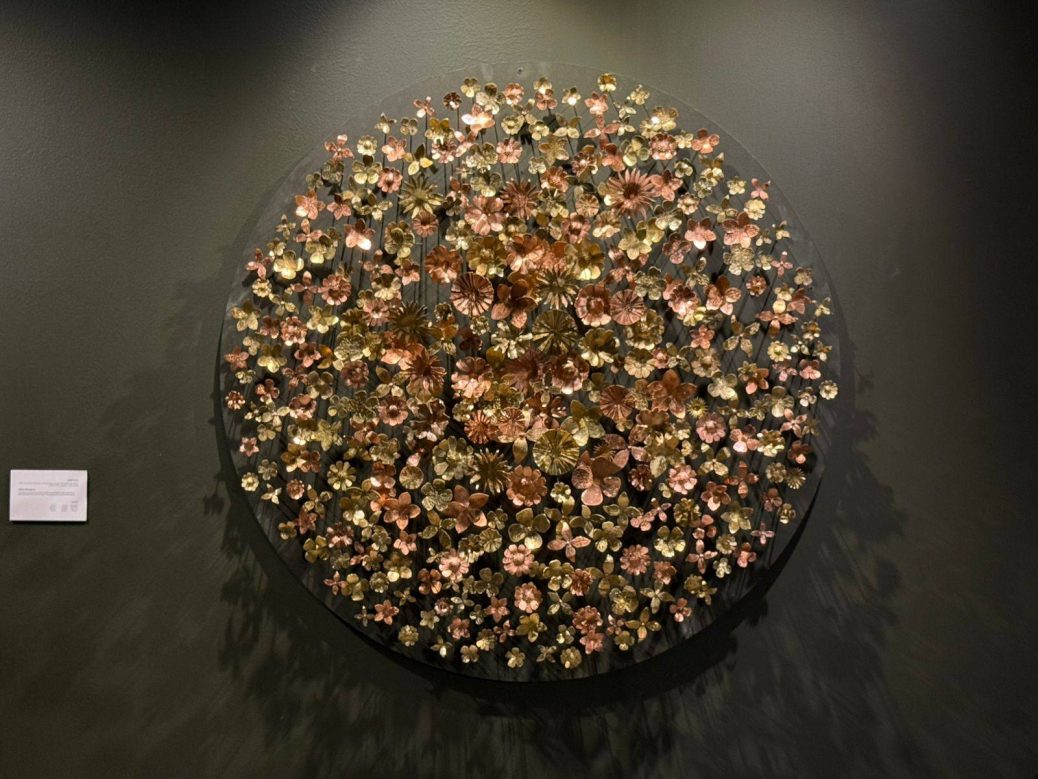 ويحضر العمل الفني «مدارات الازدهار» بوصفه من أبرز المعروضات، وهو تركيب فني معاصر يتكون من 320 زهرة معدنية مَصوغة يدوياً من الفضة والنحاس، استلهم زهور السعودية من بينها الياسمين، والخزامى، والبهق، والأقحوان البري، وأنجز العمل 12 طالبة خلال 20 يوماً، ضمن مخرجات المستوى الأول من دورة المعادن التقليدية، التي تدرس تقنيات القص والتلحيم، تمهيداً لمراحل متقدمة تشمل تركيب الأحجار الكريمة والتشكيل بالفضة.