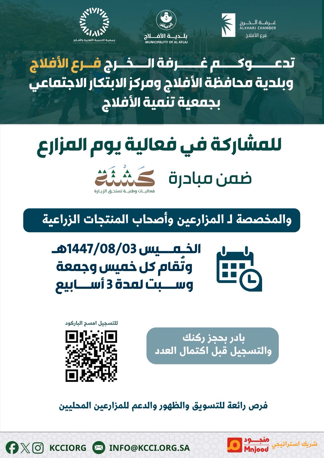 أعلنت غرفة الخرج (فرع الأفلاج) بالتعاون مع بلدية محافظة الأفلاج ومركز الابتكار الاجتماعي بجمعية تنمية الأفلاج، عن إطلاق فعالية “يوم المزارع”، والتي تأتي ضمن مبادرة “كشتة” الوطنية.