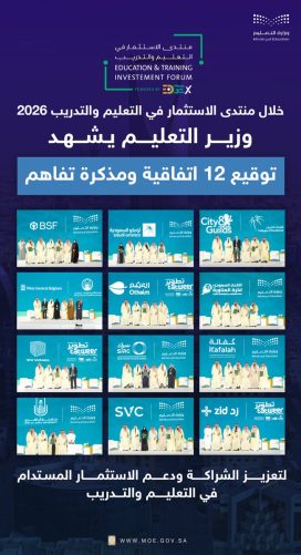 رعى وزير التعليم الأستاذ يوسف بن عبدالله البنيان افتتاح أعمال النسخة الثانية من منتدى الاستثمار في التعليم والتدريب 2026 في الرياض، مؤكدًا توجه الوزارة لتحويل التعليم إلى قطاع اقتصادي ومنصة إنتاج وطني تسهم في تحقيق مستهدفات رؤية السعودية 2030، بحضور الأمير سعود بن طلال بن بدر آل سعود محافظ الأحساء، والأميرة ريم بنت الوليد بن طلال آل سعود، ووزير الاستثمار المهندس خالد بن عبدالعزيز الفالح، وعدد من القيادات والمستثمرين والخبراء، وأوضح البنيان أن القطاع يحظى بدعم القيادة في إطار برنامج تنمية القدرات البشرية ورؤية 2030 لتعزيز دوره كمحرك للنمو المستدام، مشيرًا إلى تمكين القطاعين العام والخاص وغير الربحي عبر ممكنات تشريعية وتنظيمية وتشغيلية ومالية.