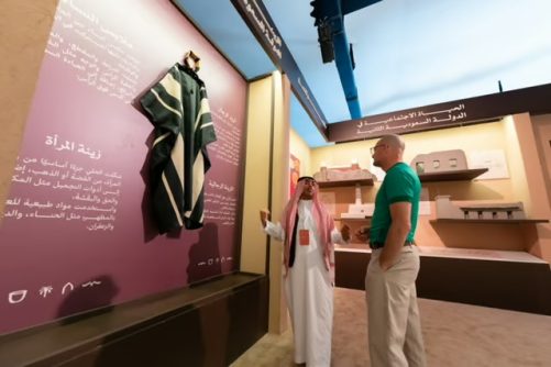ويبدأ مسار المعرض بالمنطقة الترحيبية التي تستقبل الزوار بفيلم “التأسيس”، بوصفه المدخل المفاهيمي للرحلة، مستعرضًا رمزية “العوجا” ودلالاتها التاريخية، ومؤسسًا لفهم وحدة الهوية والاعتزاز بالجذور، ومجسدًا النخوة باعتبارها قيمة جامعة شكّلت مسيرة الدولة.