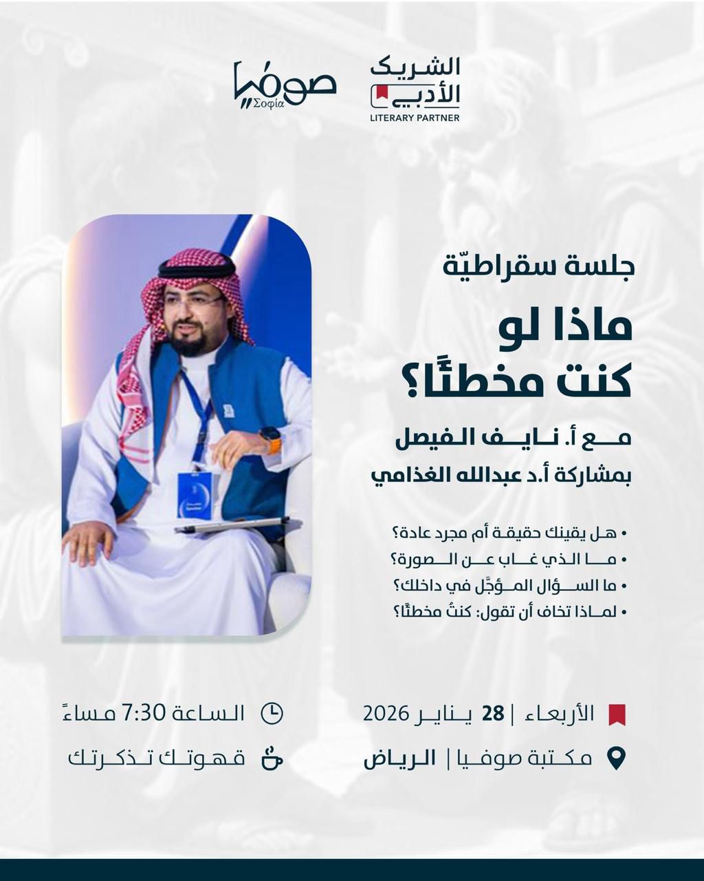 تستضيف مكتبة “صوفيا” في الرياض، ضمن مبادرة “الشريك الأدبي”، أمسية فكرية استثنائية تحت عنوان “جلسة سقراطية: ماذا لو كنت مخطئاً؟”، وذلك مساء اليوم الأربعاء 28 يناير 2026.
